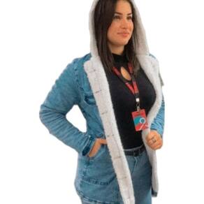 Parka Jeans Feminina com capuz com muito elastano, toda forrada com tecido peluciado, confortável e bem quentinha.