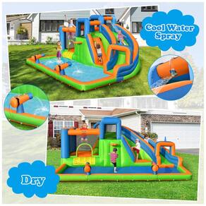 A área de salto é cercada por uma parede de malha respirável de 4 lados e as grades de proteção elevadas dos escorregadores aumentam ainda mais a segurança. O parque aquático do quintal foi projetado com canhões de água e um aspersor superior, que fornecem spray de água fria constantemente para deixar as crianças imersas em brincadeiras ao ar livre.