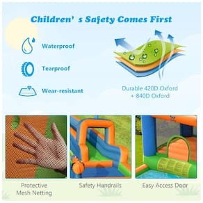 Além disso, a casa inflável de salto de água combina uma variedade de funções e entretenimento em um, incluindo um longo escorregador, parede dupla de escalada, piscina infantil e área de salto. Feito de material durável à prova d água, resistente a rasgos e com costura de reforço duplo, o castelo saltitante pode acomodar várias crianças para brincarem juntas com segurança.