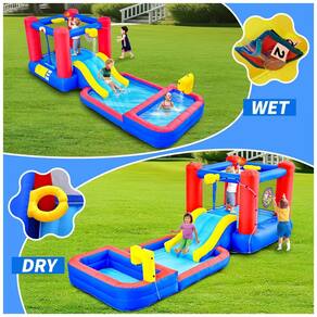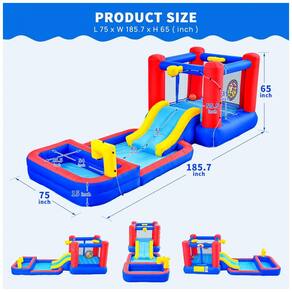Com um design robusto inspirado em castelos, esta casa de pula-pula é feita com materiais de alta qualidade e resistentes a perfurações. Sua estrutura reforçada suporta horas de brincadeiras energéticas, garantindo durabilidade. Completa e versátil, oferece área de pulo, tobogã, sprinklers, alvo de dardos e piscinas fundas e rasas. Perfeita para divertir até 3 crianças por horas, com cesta de basquete e alvo de dardos integrados, estimulando a brincadeira ativa e competições amigáveis. Alternando entre brincadeiras com água e secas, proporciona entretenimento ilimitado, independente do clima. Instalação rápida com inflação em menos de dois minutos, desligamento fácil, e armazenamento conveniente. O soprador de 110-120 V fornece fluxo de ar contínuo para máxima segurança. Ideal para festas, reuniões e aniversários, criando memórias inesquecíveis para as crianças. Transforme o quintal em um mundo de imaginação, diversão e risadas.