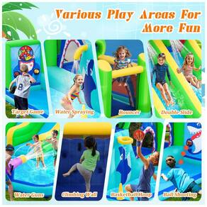 Apresentamos a Casa Inflável com Tobogã e Parque Aquático da FBSPORT, perfeita para o verão, festas de aniversário, festivais e feriados. Com uma ampla piscina onde as crianças podem brincar e ter batalhas de água, a diversão é garantida. Este parque aquático inflável inclui tudo que você precisa: um inflável com duplo tobogã, parede de escalada, área de pulo, arremesso de argolas, cesta de basquete, splash e muito mais. Fabricado com material PVC espesso e seguro, possui costuras duplas para maior durabilidade e segurança. Além de afastar as crianças dos eletrônicos, incentiva o desenvolvimento de habilidades motoras, socialização e brincadeiras criativas. Com áreas de jogo diversificadas, como jogo alvo, pistolas d'água, parede de escalada, tobogã duplo e muito mais, este parque aquático é garantia de entretenimento sem fim. Aproveite a diversão ao ar livre com segurança e praticidade. Aproveite agora!
