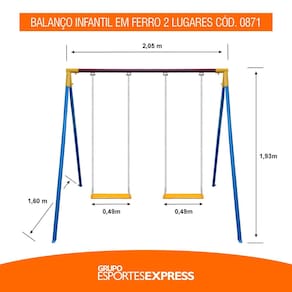 Gangorra com Duas Pranchas Infantil (Madeira e Ferro - Esportes Express - Cód. EE290416): A gangorra, com quatro lugares, oferece diversão equilibrada. Fabricada com materiais de alta qualidade, inclui pegadores emborrachados para uma aderência segura.Dimensões do Produto Montado:Balanço Tradicional: 2,05m de comprimento, 1,60m de largura, 1,93m de altura. Peso 35Kg.Banco para Jardim: 1,50m de comprimento, 0,40m de largura, 0,81m de altura. Peso 25Kg.Escorregador: Altura de 1,40m, largura da prancha de 0,50m, pista de 2,00m. Peso 40Kg.Carrossel: Diâmetro de 1,57m e altura de 0,75m. Peso 45Kg.Gangorra com Duas Pranchas: 2,15m de comprimento, 1,20m de largura, 0,47m de altura. Peso 35Kg.
