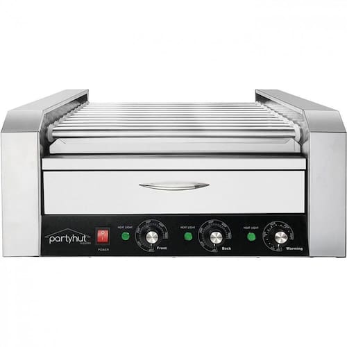 Gaveta de aquecimento de pão embutida com controle de temperatura próprio. O controle duplo de temperatura frente e verso permite cozinhar e, ou manter cachorros quentes aquecidos para maior eficiência de serviço.\n11 rolos de aço inoxidável antiaderente e de qualidade premium, giram 360 graus, podem cozinhar até 30 cachorros quentes por lote.\nPerfeito para usos comerciais e domésticos, como lojas de conveniência, lojas de bebidas, reuniões longas, s de agricultores, todos os eventos esportivos e muito mais.\nConstrução durável em aço inoxidável. Fácil de usar e fácil de limpar. Aprovado pela CE.Tipo
