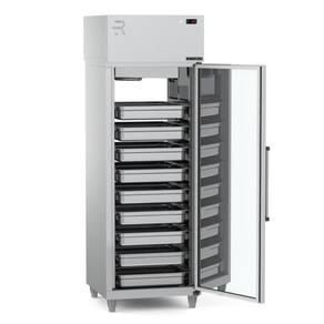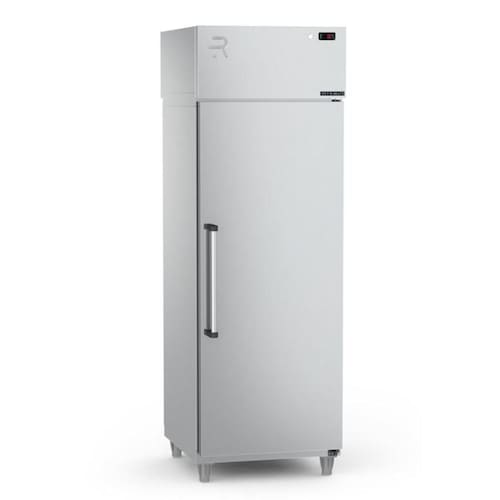 Características Técnicas: Temperatura: 0 a 5C Volume interno: 600 litros Sistema de refrigeração: Ar forçado Controlador digital de temperatura Gabinete interno e externo em aço inox 430 brilhoso Isolamento térmico em poliuretano injetado Adesivo na testeira personalizável Porta com puxador em tubo de aço e fechamento automático Capacidade de 18 GNs 1/1 - 100mm Pés em termoplástico reguláveis Potência: 1/4 CV