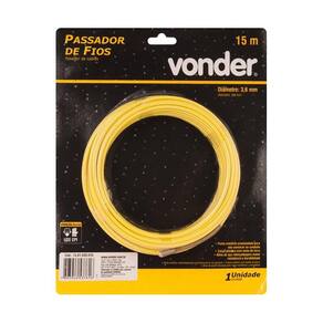 Informações do produto: Passador de fios com 15 metros. Com Alma de Aço - 78.61.035.015 Indicado para passar fios em tubulações . Possui alma de aço reforçada para maior resistência e durabilidade. Além de ponta metálica arredondada para não enroscar no conduíte. Material do corpo do passador de fios Corpo plástico com mola de ferro Cor do passador de fios Amarelo Comprimento do passador de fios 15.0 m DiÂmetro do passador de fios 3.6 mm - E CDC legal: 90 diasConteÚdo da Embalagem: - 1 Passador de fios. Passa Fio 15m Vonder Com Alma Aço Passador de fios com 15 metros, Com Alma de Aço Indicado para passar fios em tubulações. Possui alma de aço reforçada para maior resistência e durabilidade, além de ponta metálica arredondada para não enroscar no conduíte. Material do corpo do passador de fios Corpo plástico com mola de ferro Cor do passador de fios Amarelo Comprimento do passador de fios 15,0 m Diâmetro do passador de fios 3,6 mm - E CDC legal: 90 dias Conteúdo da Embalagem 1 Passador de fios. Informações do Produto Passador de fios com 15 metros, Com Alma de Aço - 78. 61. 035. 015 Indicado para passar fios em tubulações. Possui alma de aço reforçada para maior resistência e durabilidade, além de ponta metálica arredondada para não enroscar no conduíte. Material do corpo do passador de fios Corpo plástico com mola de ferro Cor do passador de fios Amarelo Comprimento do passador de fios 15,0 m Diâmetro do passador de fios 3,6 mm - E CDC legal: 90 dias Conteúdo da Embalagem - 1 Passador de fios. Cor: Laranja Marca: Vonder Fabricante: Vonder Ean: 7893946537616
