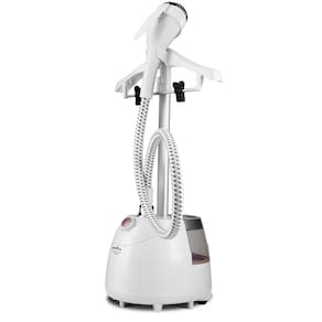 Passadeira a vapor com 1800W de potência, haste regulável, mangueira com cobertura isolante, aquecimento rápido, reservatório de 2,6L com autonomia de 1h20min, desligamento automático e rodas para facilitar o manuseio. Inclui suporte para cabide, escova, luva e acessório de apoio.Lâmpada piloto