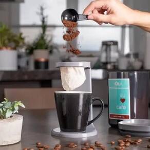 1. Monte o Passador de Café My Coffee. Encaixe o coador de pano no suporte e coloque uma xícara embaixo dele. 2. Coloque café no coador. 3. Despeje água quente sobre o café com calma. 4. Pronto Agora é só apreciar um cafezinho quentinho.