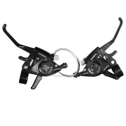Manetes de freio com os trocadores de marchas de até 21 velocidades Alavanca-fire index 21v. Marca: yamada Modelo: indexado Cor: preto Modelo: sp n08 Material: alumínio e polimero termoplastico Peso aproximado: 400g Lado direito: 7v. Lado esquerdo: 3v. Trocador funciona com câmbios shimanos de 21 velocidades, permitindo a troca de marcha rápida e precisa, com mostrador de velocidades e manete integrada ao mudador. Excelente custo beneficio Acompanha: 01 alavanca lado direito 7v. 01 alavanca lado esquerdo 3v. 02 cabos de marcha já instalado Ean: 6970365350253
