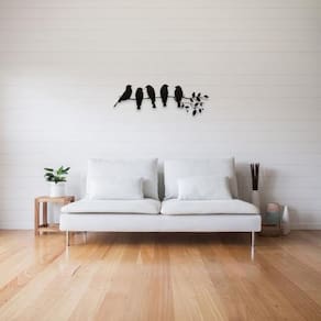A decoração em metal com o Tema Pássaros foi projetada a partir da imagem de pássaros em pé em um galho, com aspecto simples e elegante. Feito em aço carbono de alta qualidade, proporcionando resistência e durabilidade. A pintura de nossos produtos é feita pela tecnologia eletrostática, que não enferruja e cobre toda a superfície com perfeição. A decoração tem pequenos orifícios em ambos os lados, e você pode optar por instalá-lo com parafusos que acompanham o kit ou uma fita dupla face não acompanha o produto .