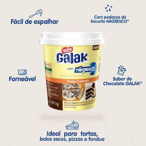 Fácil de espalhar ideal para uso em tortas, bolos secos, pizzas e fondues forneável sabor do chocolate Galak com pedaços de biscoito Negresco.