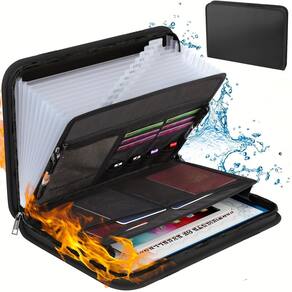 Material: fibra de vidro Cor do tecido: preto Tamanho da embalagem: 38 × 28 × 6 cm Peso da embalagem: 0,61 kg Lista de embalagem: 1 × pasta de arquivos à prova de fogo Este organizador de arquivos em estilo acordeão é feito com tecido de fibra de vidro premium à prova de fogo e à prova d'água, oferecendo proteção de camada dupla para manter os documentos protegidos contra incêndio, derramamentos e acidentes inesperados. Com 13 bolsos expansíveis com etiquetas alfabéticas, ele permite a classificação eficiente e a recuperação rápida de arquivos, certificados, cartões e documentos importantes sempre que você precisar deles. A pasta inclui vários bolsos de malha e compartimentos para cartões, fornecendo armazenamento extra para passaportes, canetas, cartões de crédito, drives USB e outros itens essenciais, maximizando a conveniência organizacional. Um fecho de zíper resistente garante total segurança, evitando que documentos caiam e, ao mesmo tempo, oferece proteção total, tornando-o ideal para uso doméstico, no escritório ou em viagens. Seu design portátil e dobrável com um perfil fino permite fácil armazenamento em gavetas, prateleiras e mochilas, tornando-o uma solução confiável e que economiza espaço para proteger documentos valiosos.