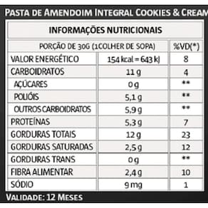 Pasta Integral de Amendoim Vitapower Cookies & Cream Vitapower é fonte de vitaminas e minerais, ideal para acompanhar o seu treino. Energético 100% Natural Alto teor de proteína: É ideal para todos os tipos de dietas, seja hipercalórica para pessoas que tem dificuldade em ganhar massa muscular ou hipocalórica que tem dificuldade em . Baixo teor de carboidratos: A gordura presente na Pasta de Amendoim Vitapower é aquela considerada boa, são ácidos graxos poliinsaturados que protegem o corpo de doenças cardiovasculares. Zero aditivos Zero Açúcar Zero Sódio Zero Lactose Zero Glúten Zero Gordura Trans Sugestão de uso: Pronto para o consumo. Sabor natural de amendoim torrado, sem sal e sem açúcar. Pode haver uma separação natural do óleo de amendoim da pasta. Basta misturar para que ela volte a sua condição normal para utilização. Ingredientes: Amendoim torrado, maltiol, de cacau, leite em pó zero lactose, flocos de cookies fécula de mandioca, farinha de arroz branco, gordura de palma, cacau, banana verde, sal, bicarbonato de sódio e sucralose , polidextrose, aroma idêntico ao natural de creme. Não contém glúten. Alérgicos: contém amendoim e derivados do leite. ANVISA: Registro ISENTO conforme resolução RDC 27 de 06 de agosto de 2010 anexo I.