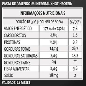 Pasta Integral de Amendoim Vitapower Shot Protein Vitapower é fonte de vitaminas e minerais, ideal para acompanhar o seu treino. Energético 100% Natural Alto teor de proteína: É ideal para todos os tipos de dietas, seja hipercalórica para pessoas que tem dificuldade em ganhar massa muscular ou hipocalórica que tem dificuldade em perder peso. Baixo teor de carboidratos: A gordura presente na Pasta de Amendoim Vitapower é aquela considerada boa, são ácidos graxos poliinsaturados que protegem o corpo de doenças cardiovasculares. Zero aditivos Zero Açúcar Zero Sódio Zero Lactose Zero Glúten Zero Gordura Trans Sugestão de uso: Pronto para o consumo. Sabor natural de amendoim torrado, sem sal e sem açúcar. Pode haver uma separação natural do óleo de amendoim da pasta. Basta misturar para que ela volte a sua condição normal para utilização. Ingredientes: Amendoim torrado, mgranulado de amendoim torrado, leite em pós zero lactose, maltitol, manteiga de cacau, cacau, aroma idêntico ao natural de chocolate, sucralose. Não contém glúten. Alérgicos: contém amendoim e derivados do leite. ANVISA: Registro ISENTO conforme resolução RDC 27 de 06 de agosto de 2010 anexo I.