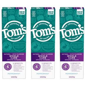 Tom's of Maine Pasta de dente natural Whole Care com flúor, hortelã-pimenta, 118 g. Pacote com 3 (a embalagem pode variar) - O que você receberá: três tubos de 118 g de pasta de dente Tom's of Maine Whole Care com sabor de hortelã - Uma pasta de dentes, seis benefícios: a pasta de dente com flúor combate as cáries, fortalece o esmalte e promove a remineralização - Cuidados com a boca inteira: também clareia os dentes, evita o acúmulo de tártaro e refresca o hálito - Tubo reciclável: procure a bandeira azul de reciclagem, esprema o máximo de pasta de dente que puder, substitua a tampa e recicle - CUIDADO DE SI MESMO NATURALMENTE: Não contém adoçantes, conservantes, cores ou sabores artificiais e não é testado em animais