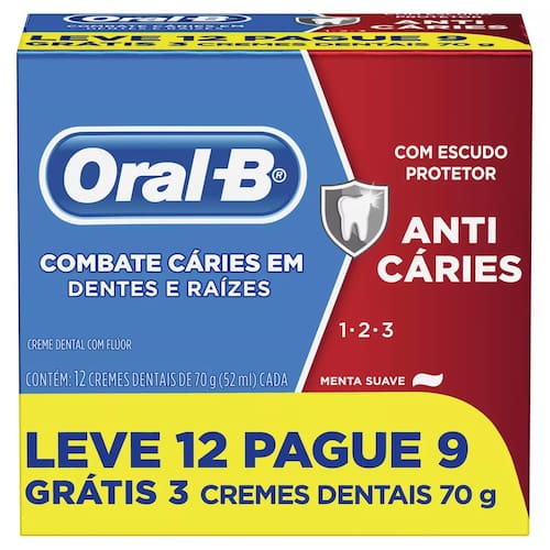 O Creme Dental Oral-B 123 Menta Suave 70g cuida da gengiva e dos dentes com total eficiência, prevenindo a gengivite antes mesmo que ela se desenvolva. Diferentemente das pastas de dente comuns, ela ajuda a eliminar a placa ao longo da linha da gengiva e a interromper o ciclo da gengivite. Oral-B é uma das marcas mais recomendadas pelos dentistas. Seus ingredientes ativos garantem boca e dentes mais saudáveis, e um hálito suavemente refrescante. Seu sabor garante uma sensação de higiene e frescor por mais tempo.