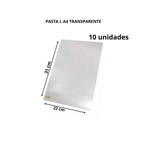 10 PASTAS PLÁSTICA DE OFÍCIO FORMATO L. QUANTIDADE: 10 UNIDADES. COR: CRISTAL ( TRANSPARENTE). TAMANHO; LARGURA: 22 CM. COMPRIMENTO: 31 CM. FORMATO: OFÍCIO EM L. Formato para folhas A4. MATERIAL: PLÁSTICO/ POLIPROPILENO.