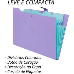 Especificações técnicas: - Material: Plástico resistente - Tamanho: A4 - Divisórias: 5 divisões expansíveis - Botão para fechamento - Decoração na capa - Cartela de etiquetas inclusa