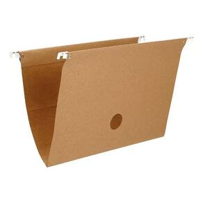 Pasta suspensa Kraft. Acompanha visor e etiqueta, grampo plástico e hastes metal fixas. Abas coladas; Possui posições para grampos e 2 posições para arquivo de saco plástico. Visor e etiquetas para identificação e visualização do conteúdo. Visualização frontal de documentos, através de furo central. Vinco marcador de páginas. Dobra pode ser usada como apoio de documentos.