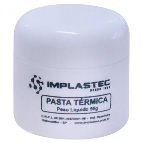 Pasta Termica Implastec A Base De Silicone Pote 50g Pasta Termica Implastec a Base de Silicone Pote 50G Características A Pasta Térmica Implastec, foi desenvolvida para permitir um perfeito acoplamento e eliminar o ar entre montagens. Permite-se trabalhar numa região de temperaturas mais seguras com maior eficiência. Por melhor que seja a superfície montada, a pasta preenche as micro lacunas de ar que possam existir, aumentando a performance térmica do sistema gerador de calor x dissipador.