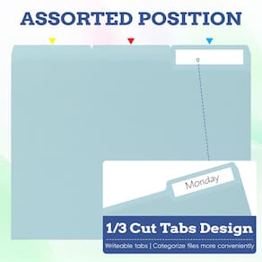 - Design de aba de corte de 1/3: as abas de corte 1/3 de três posições fornecem amplo espaço de etiquetagem para identificação rápida de conteúdo, simplificando a recuperação de documentos e melhorando a eficiência do fluxo de trabalho em qualquer configuração.