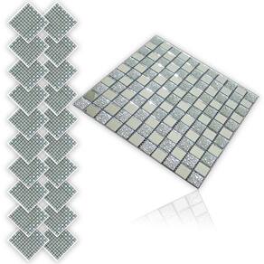 Transforme seus ambientes com esta pastilha decorativa feita de vidro verdadeiro, combinando brilho, textura e um visual moderno. O design em padrão geométrico cria um efeito visual sofisticado, com peças retangulares em tom prata e detalhes texturizados que adicionam profundidade e requinte.