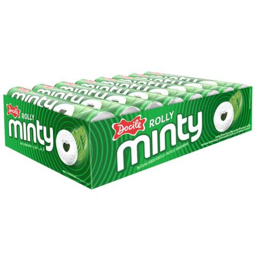 Caixa contendo 16 drops de bala pastilha sabor menta Rolly Minty com 29 gramas cada. Peso total da embalagem 464 gramas.