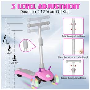 As rodas piscantes divertidas com LED são alimentadas por um sistema autogerado, que acenderá automaticamente as rodas quando seus filhos começarem a andar e não houver necessidade de bateria. As luzes LED coloridas no volante que brilham e se destacam proporcionam mais diversão para a criança brincar, o que também é uma garantia de segurança para andar à noite. A Scooter Elétrica Infantil possui 3 alturas ajustáveis e 3 guidões ajustáveis, além de um pedal extralargo que acomoda uma carga máxima de 50 kg.