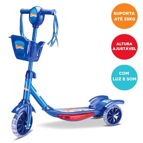 Um presente divertido e alegre, repleto de energia que envolve tanto o corpo quanto a mente. As crianças vão adorar sua base iluminada enquanto ouvem músicas. Possui uma cestinha para que as crianças possam colocar brinquedos ou outros objetos. É dobrável e prático para que você possa levar em suas viagens.INFORMAÇÕES:- Peso: 35kg- Medida suporte: 30x15cm - Medida guidão: 24x4cm- Altura patinete: 72x60cm CUIDADOS:- Não deixe a parte de baixo do patinete molhar, pois é onde as pilhas se encaixam.CONTÉM:- 3 Rodas - 1 cestinha - 1 guidão - Peças de montagem - Suporte para os pés - NÃO acompanha pilhas para o funcionamento do som e da luz.PILHAS:- 3 pilhas AA 1,5 V para o funcionamento do som e da luz.