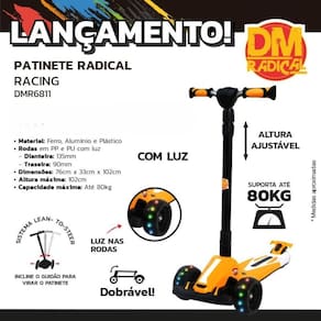 O Patinete Radical Racing é irado Possui luz nas rodas e é dobrável, facilitando no momento de guardar e transportar. Com sistema lean-to-steer, é só inclinar o guidão para o patinete virar.