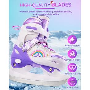 Patins de gelo para crianças, meninas, patins de gelo para crianças pequenas - Patins de gelo ajustáveis de 4 tamanhos para crianças: os patins de gelo Fitense para crianças oferecem 4 tamanhos ajustáveis para crescer com os pés do seu filho, garantindo que as crianças aproveitem esses patins de gelo por muitos anos. Basta pressionar o botão e estender o bico para alcançar um comprimento adequado do sapato. (Pequeno: 9C-12C, Médio: 12C-2Y, Grande: 3Y-6Y) - Estilo princesa sonhadora e pacote requintado: nossa caixa de presente de alta qualidade cuidadosamente trabalhada para patins de gelo infantis, com seu design elegante, a torna a escolha de presente perfeita para o Natal, aniversários e outras ocasiões especiais. Deixe as meninas entrarem em um mundo de sonhos repleto de estrelas e se tornarem uma princesa deslumbrante no gelo! - Lâminas de alta qualidade para patinação suave: estes patins de gelo para meninas apresentam lâminas premium projetadas para deslizamento suave, controle preciso e excelente durabilidade. Com propriedades resistentes ao desgaste e à corrosão, garantem desempenho a longo prazo e uma experiência excepcional de patinação no gelo. Perfeito para uso interno e externo - Forro quente e confortável: nossos patins de gelo para meninas apresentam um forro de tecido e acolchoamento confortável para garantir conforto e calor extra mesmo em climas frios. O forro espesso oferece maior conforto, estabilidade e absorção de choque, reduzindo a fadiga do pé durante a patinação. O revestimento externo robusto resiste à quebra e protege contra fragmentos de gelo, mantendo os pés secos e seguros contra respingos. - Proteção tripla de segurança e fácil armazenamento: nossos patins de gelo para meninas estão equipados com proteção tripla, incluindo fivelas, fechos de gancho e laço e cadarços para garantir que os pés do seu filho estejam presos com segurança enquanto patina. Além disso, uma bolsa de skate de alta qualidade está incluída para armazenamento conveniente e portabilidade, facilitando o transporte e o armazenamento dos patins. Desfrute de patinação sem complicações com tranquilidade!