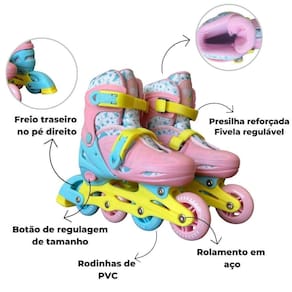 - produto certificado pelo inmetro e projetado com materiais de alta qualidade garantindo o conforto e agilidade necessária para manobras. - os patins também contam com sistema de rodas estáveis e duas presilhas reforçadas para uma melhor estabilidade dos pés. - freio traseiro para controle de velocidade, cano flexível e sistema de ajuste para se adequar ao tamanho - o produto acompanha um kit completo de segurança composto por um capacete, joelheiras, cotoveleiras e luvas de proteção - faixa etária recomendada: acima de 4 anos - peso máximo: 45 kg - corpo em polipropileno com bota interna em tecido forrado com espuma - alta absorção de impacto - fecho em metal e presilha polipropileno.