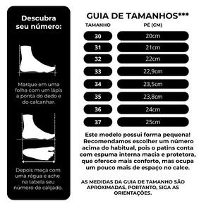 Bota interna em tecido de algodão forrado com espuma Ajustável em 4 números Rodas de PVC Freios frontais Rolamento abec 7 Peso máximo suportado: 50 kg