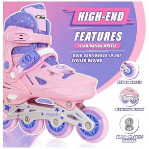 Rodas Iluminadas: Os patins em linha são equipados com 8 rodas iluminadas, todas acendendo e proporcionando uma exibição colorida do arco íris quando seu filho começa a andar de skate. As luzes são alimentadas pelas rodas em movimento e nunca precisam de substituição de baterias Dicas: verifique e aperte as rodas regularmente para evitar que caiam