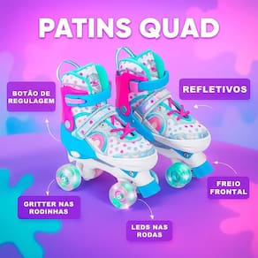 O Patins Quad Infantil Ajustável é perfeito para proporcionar diversão, segurança e incentivar a prática de atividades físicas desde cedo. Com design moderno holográfico e luzes em todas as 4 rodas, ele encanta as crianças e garante mais visibilidade durante o uso.
