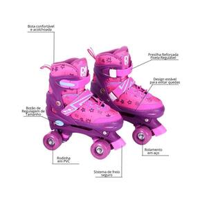 Características Principais - Ajustável: Disponível em três tamanhos ajustáveis P, M e G , permitindo acompanhar o crescimento da criança. - 4 Rodas Paralelas: Proporcionam mais estabilidade e segurança ao andar. - Freios Frontais: Garantem um controle eficaz e seguro durante a patinação. - Proteção Completa: Inclui capacete, munhequeiras, joelheiras e cotoveleiras para máxima segurança. - Design Atraente: Com uma cor rosa vibrante, o patins é moderno e divertido.