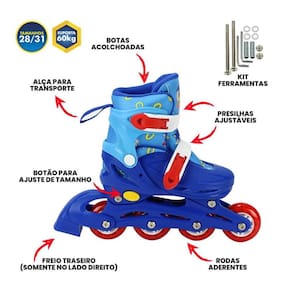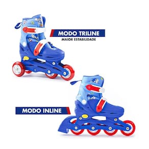 Os Patins da BBR Toys são ajustáveis e podem ser usados como In-Line ou Tri-Line, projetados pensando na segurança, estabilidade e aprendizado na patinação para a criança. É ideal para quem está começando a andar de patins. E sabe por quê? Porque ele permite configurar suas rodas em modo tri-ine para que você possa adquirir firmeza e estabilidade, transforme seu patins em tri-line ou in-line em minutos e divirta-se enquanto aprende! O patins conta com um kit de proteção completo: capacete, 1 par de joelheiras, 1 par de cotoveleiras e 1 par de munhequeiras. Ele também possui um prático sistema de fivela que melhora a fixação nos pés e dá mais confiança nas manobras. Com tamanho ajustável ele se adapta rapidamente aos pés e pode ser utilizado em diferentes fases. São feitos em material leve e resistente, com tecido interno acolchoado, aumentando o conforto e mantendo a resistência e durabilidade.