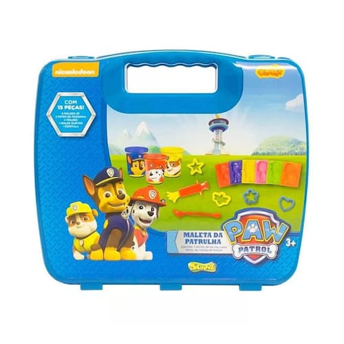 Patrulha Canina é uma série de ação e aventura da Nickelodeon, estrelada por seis filhotes heroicos: Chase, Marshall, Rocky, Zuma, Rubble e Skye, que são liderados por um menino de 10 anos de idade chamado Ryder. Com uma mistura única de habilidades para resolver problemas, veículos legais e muito bom humor canino, a Patrulha Canina trabalha em conjunto em missões arriscadas de resgate para proteger a comunidade. Maleta divertida da Patrulha Canina com 3 potes de massinha de 56,70 gr cada e 12 acessórios plásticos