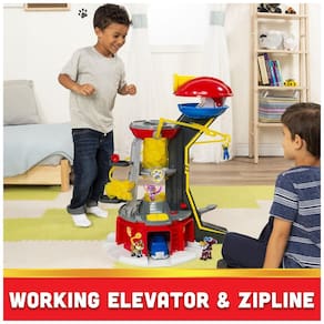 ELEVADOR E TIROLESA FUNCIONAIS Leve os filhotes ao topo da torre com o elevador e envie-os para a ação descendo pela tirolesa. Além disso, lance os veículos e os filhotes diretamente da base para iniciar o resgate.