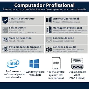 Computador completo intel i3 4º geração 8gb ssd 240gb monitor 20 w10 Computador com desempenho, preço justo e suporte de verdade - são mais de 30 anos de experiência em tecnologia, garantindo confiança e qualidade para você Equipamentos prontos para usar no dia a dia, com peças de qualidade, sistema instalado e de quem sabe o que faz. Ideal para quem busca um computador ágil e confiável, essa máquina foi pensada para lidar com várias tarefas ao mesmo tempo, sem travamentos ou perda de desempenho. Nossos diferenciais: 2. Montagem nacional com padrão Todos os nossos computadores são montados em ambiente industrial dentro do brasil, seguindo normas técnicas e rigoroso controle de qualidade. Isso garante um equipamento confiável, com suporte direto e entrega mais rápida. 3. Ssd: velocidade que faz diferença Equipado com ssd, é até 10x mais rápido que um hd comum. Inicia o sistema e abre programas em poucos segundos. 4. Desempenho com processador intel Equipado com processador intel, reconhecido mundialmente por sua estabilidade e eficiência, esse computador oferece excelente desempenho para uso diário, multitarefas e aplicações profissionais. Você verá as especificações completas do processador mais abaixo na descrição. 5. Expansível e pronto para upgrades - sem perder a Quer adicionar uma placa de vídeo dedicada Ou instalar mais memória ou um novo hd Espaço interno e conexões disponíveis para você expandir quando quiser. Instale mais memória, hd ou placa de vídeo sem afetar a de fábrica. 6. de fábrica e suporte ao cliente Produto testado, revisado e enviado pronto para uso. Conta com completa e suporte técnico direto com a gente. . Em caso de dúvidas, estamos prontos para atender você com agilidade e clareza, garantindo uma experiência pós-venda segura e confiável. Especificações técnicas: Processador Marca: intel Série: i3 4 geração Frequência: 3.40 ghz Núcleos: 2 Threads: 4 Placa-mãe Modelo: h81 chipset b85 Socket: 1150 - suporte para intel i3/i5/i7 4 geração Formato: micro atx Memória: 2 slots ddr3 - até 16gb Vídeo: hdmi + vga Slots de expansão: 1x pci express x16, 1x pci express x1 Armazenamento: 3x sata, 1x slot m.2 nvme Usb traseiras: 2x usb 3.0 + 4x usb 2.0 Rede: gigabit lan 10/100/1000 Áudio: hd integrado line in/out + mic Outros: painel frontal com conexões para áudio, usb e ventoinha Memória ram Capacidade: 8gb Armazenamento Tipo: ssd Capacidade: 240gb Gabinete Placa mãe suportada: micro atx Conexões: 2x usb e 2x áudio Cor: preto Baias: não possui Fonte Voltagem: bivolt Potência: 230w Sistema operacional Windows 10 pro vitalício Acessórios Monitor Teclado Mouse Caixa de som Monitor Especificações -tamanho da tela: 20 -formato de tela: 16:9 widescreen -resolução : 1600900 , hd+ 75hz -brilho: 300 cd/m2 -contraste: 1000:1 tipico -tempo de resposta: 5ms -suporte de cores: 16 milhões de cores - controle de ajuste digital -entrada: hdmi, vga -acompanha cabo hdmi -bivol -cor: preto -montagem da parede vesa: sim 12 meses Observações: - as imagens são meramente ilustrativas. - mudanças podem ocorrer no design do produto de acordo com o nosso momentâneo. Marca: Não Informado