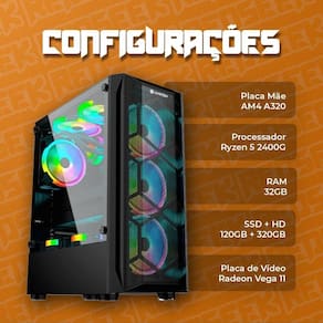 - sistema operacional: totalmente configurado e pronto para uso; - gabinete: ge - gamer com 3 cooler's frontais e lateral em acrílico; - fonte: 500w; - placa mãe: am4 a320; - processador: ryzen 5 2400g; - memória ram: 32gb; - armazenamento: ssd 120gb + hd 320gb; - placa de vídeo: radeon vega 8 integrada ; - montagem: cable management de alto padrão, com todos os cabos organizados. Itens inclusos: