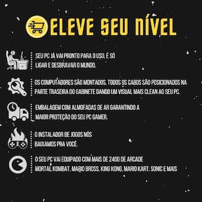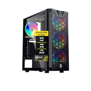 Processador intel i7 de 7º geração Placa mãe h110 Placa de video rtx 3050 8 gb de memória gddr6 16gb de memória ram ddr4 Ssd de 1tb Fonte atx 600w Sistema operacional windows 11 Interface de vídeo: hdmi, displayport e dvi-d Suporte para 3 monitores simultâneos