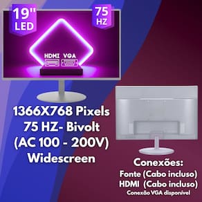 ** MONITOR LED 19" BRANCO** - Furação para Suporte Vesa; - Conexões de vídeo: HDMI e VGA; - Taxa de atualização: 75Hz; - Resolução: HD 1440x900; - Tipo da tela: LED; - Energia: Bivolt.