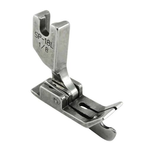 Calcador utilizado para dar acabamentos em costuras externas de peças como calças, bermudas, golas de camisas, serve tanto para firmar quanto para dar acabamento na peça, dando um caimento mais sofisticado. Possui mola que facilita o movimento do calcador para que ele fique bem apoiado na dobra, fazendo com que a peça suba e desça sem entortar a costura.