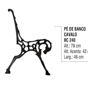 Pé de Banco Para Praça Cavalo em Alumínio Fundido (Par) Pé de Banco Para Praça, ideal para condomínios, jardins, praças, parques, estacionamentos, vias urbanas e áreas externas e internas em geral. Pode ser utilizada em regiões de praianas, pois não sofre ação da maresia. Ótimo custo benefício. Cores disponíveis dos Pés: Preto Brilhante, Branco, Dourado Craqueado, Dourado Pátina, Ouro Velho, Preto Fosco, Amarelo, Vermelho, Azul, Marrom, Prata Craqueado, Grafite e Verde Musgo Texturizado. Favor informar no campo de mensagem a cor desejada. Todas as cores citadas estão à mostra como imagem terciária do anúncio. Se o comprador não se pronunciar quanto a cor, será enviada a cor padrão Preto Brilhante. Características do Produto: Altura: 76cm. Altura do Acento: 42cm. Largura: 46cm. Itens Inclusos: 01 Pé de Banco Para Praça Cavalo em Alumínio Fundido (Par) Código: BC240PÉ undefined