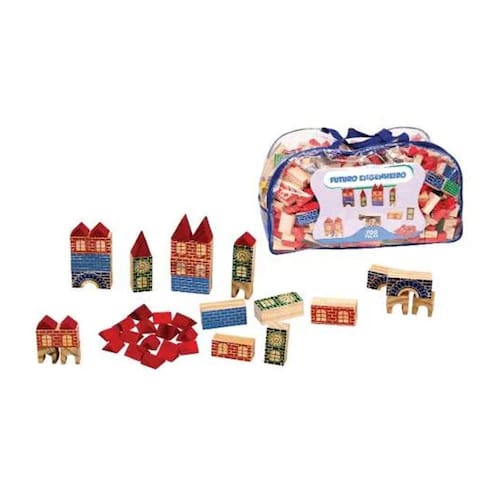 Conjunto confeccionado em madeira, impresso em silk-screen, contendo 700 peças. Acondicionado em sacola de PVC tranparente, com zíper e alça.