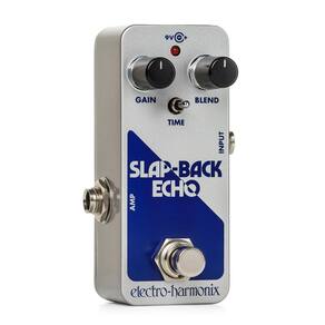 O pedal Echo Electro-Harmonix Slap-Back da década de 1970 é relançado com atualizações modernas e uma pegada do Pico! A era dos anos 50 deu origem a um som icônico no qual um único atraso curto foi utilizado para adicionar profundidade e efeito rítmico em inúmeras gravações. O design totalmente analógico recém-reeditado do EHX Slap-Back Echo proporciona este amado som clássico e muito mais em um pacote adequado para pedaleira do tamanho Pico. Com três configurações de tempo de atraso e até +20 dB de impulso, o Slap-Back Echo pode alcançar efeitos de duplicação sutis para reflexos intensos do banheiro, tudo com o sabor distinto dos circuitos de brigada de balde (BBD). Instalado no chassi do tamanho Pico da EHX, o Slap-Back Echo possui botões Gain e Blend, bem como um interruptor de horário. O botão de ganho controla o sinal de entrada antes do circuito de eco e também ajusta o volume geral na saída com um aumento de até +20dB. O botão Blend mistura o sinal seco e o sinal de eco de 100% seco a 100% eco. O interruptor de horário seleciona entre três tempos de atraso diferentes: 45 ms, 65 ms e 100 ms.