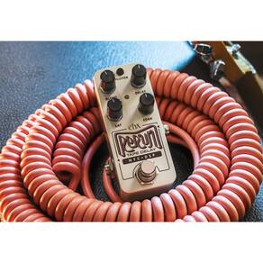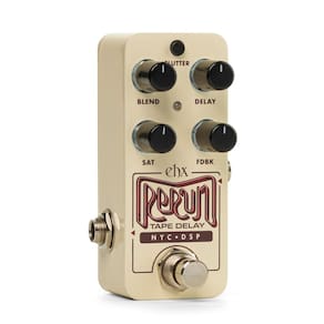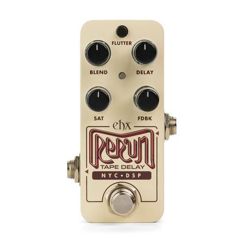 O delay de fita é apreciado por seu calor e imperfeições encantadoras em comparação com os atrasos digitais imaculados. Seus pré-amplificadores poderiam ficar saturados e, com o tempo, a fita em unidades de atraso antigas se degradaria, causando uma distorção característica amada por muitos. Esses elementos exclusivos são capturados e embalados no delay de fita Pico Rerun da Electro-Harmonix. Com base no algoritmo de atraso de fita encontrado no Canyon Delay & Looper, o Rerun oferece vibrações vintage com recursos modernos. O Rerun apresenta um conjunto de controles simples e um ritmo de toque para facilitar o uso em qualquer situação. BLEND define a mistura úmida/seca. DELAY ajusta o tempo de atraso de 8ms para 3s. O SAT adiciona saturação e distorção da fita para aumentar a trituração apenas do sinal úmido, mantendo o sinal seco inalterado pela distorção adicional. O FDBK define o nível de repetições de 1 a infinito para oscilação descontrolada. Você também pode pressionar e segurar o pedal para ativar repetições infinitas em um instante. O interruptor do modo FLUTTER alterna entre efeitos de modulação baixos, médios e pesados, desde um leve refrão até a espessura do enjôo. O Tap Tempo é simples e fácil de usar. Basta pressionar e soltar o pedal pelo menos duas vezes para definir o tempo e o LED piscará para confirmar o tempo do toque. Além disso, o Rerun também possui um bypass Tails selecionável, permitindo que os ecos continuem após colocar o pedal no bypass.