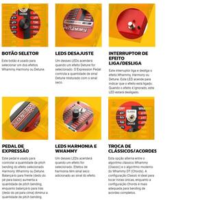 ESPECIFICAÇÕES TÉCNICAS: • Taxa de amostragem: 44,1 kHz • Resposta de frequência: 20 Hz a 20 kHz • Relação sinal-ruído: > -105 dB (ponderado A); ref = nível máximo, largura de banda de 22 kHz • DHT: 0,004 a 1 kHz; ref = 1 dBu com unidade • Conversão A/D: 24 bits • Conversão D/A: 24 bits • Consumo de energia: 2,4 Watts (< 265 mA a 9 VCC) • Adaptador de energia: Adaptador externo de 9 VCC • Bypass verdadeiro: Sim. Com o circuito true bypass, o whammy é completamente ignorado quando os efeitos Whammy e Drop Tune estão desligados.