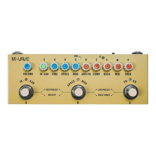 Pedal M Vave Cube Baby AC acústico Descrição O M-Vave Cube Baby AC é uma pedaleira multi-efeitos portátil projetada especialmente para violões acústicos. Compacta e repleta de recursos, ela oferece tecnologias como o sistema automático de anti-feedback em tempo real com até 8 filtros notch de alta precisão, garantindo um som limpo mesmo em volumes elevados. Conta com efeitos essenciais como equalizador de 3 bandas, compressor, tremolo, chorus, delay e reverb, além de 8 slots para perfis IR de violões acústicos, que simulam diferentes corpos e características de instrumentos. Com três modos de operação Preset, Live e Edit , o Cube Baby AC permite salvar até 3 presets personalizados. Possui conexão USB para gravação direta função de placa de som , entrada de áudio wireless via Bluetooth e saída dedicada para gravação com celular. Sua bateria interna recarregável proporciona liberdade para tocar onde quiser. O usuário também pode editar os presets e importar novos arquivos IR através de software para computador, disponível no site oficial da marca. Especificações Técnicas: - Pedaleira multi-efeitos para violão acústico - Sistema automático de anti-feedback com até 8 filtros notch - Equalizador de 3 bandas Graves, Médios e Agudos - Efeitos: Compressor, Tremolo, Chorus, Delay, Reverb - 8 slots para perfis IR de violões acústicos - Modos de operação: Preset, Live e Edit - 3 presets editáveis e armazenáveis - Interface de áudio USB função de placa de som - Entrada de áudio wireless Bluetooth - Saída para gravação em celular - Compatível com software para edição de presets e importação de IRs - Taxa de amostragem: 24bit/48kHz - Entrada: Padrão 1/4 mono TS - Saída: Padrão 1/8 mono TS - Bateria interna recarregável Itens Inclusos - 1 Pedaleira M-Vave Cube Baby AC - 1 Cabo de carregamento USB - Cabos internos - Manual de instruções : 3 meses de pelo fabricante Origem: China. Imagens meramente ilustrativas. Homologação Anatel: 164712304809