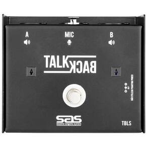 - Marca: Santo Angelo - Modelo: Talk Back TBLS - Tipo: Pedal Para Comunicação no Palco - Material: Aço carbono - Cor: Preto - Botão sem trava - Possui LED indicador de canal utilizado - Conector de entrada: 1 XLR Fêmea Microfone - Conectores de saída: 2 XLR Macho Canal A e B - Dimensões: 24 cm x 12 cm x 6 cm - Peso: 0,570 kg Marca: SAS